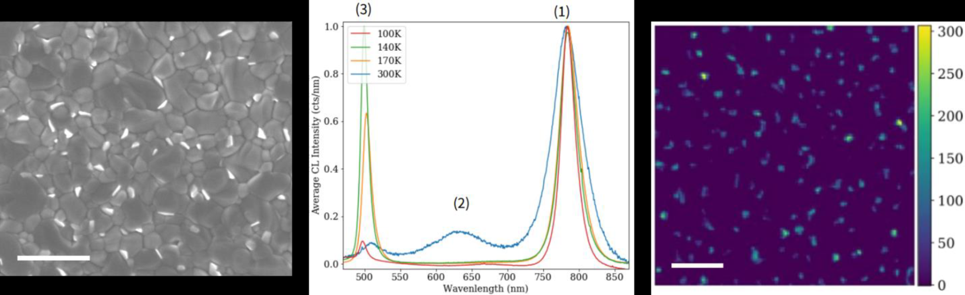 在不同溫度下在鈣鈦礦膜上記錄的陰極發(fā)光光譜。來(lái)自(1)鈣鈦礦、(2)束誘導(dǎo)分解產(chǎn)物和(3)PbI2(中間)的發(fā)光;