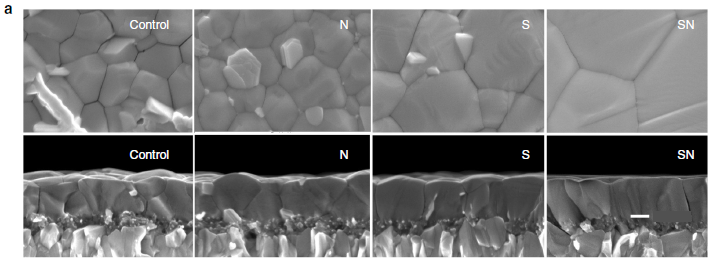 沉積在中孔-TiO2/致密-TiO2/FTO上的原始(對(duì)照)和含有調(diào)節(jié)劑(N、S和SN)鈣鈦礦膜的平面圖(頂部)和橫截面(底部)SEM圖,