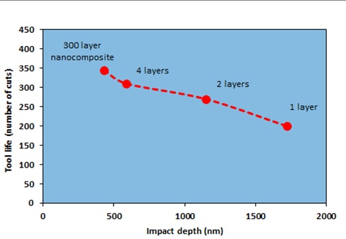 在最近發(fā)表的一篇論文中,Bouzakis比較了多層PVD TiAlN涂層系統(tǒng)的性能。這種系統(tǒng)是延長涂層材料壽命的有效方法。納米沖擊測試被證明是優(yōu)化分層系統(tǒng)的有力輔助。銑削硬化鋼的刀具壽命(切削次數(shù))與最大沖擊深度進(jìn)行了比較。圖2顯示了各種系統(tǒng)的切削性能與抗沖擊性之間的良好相關(guān)性。