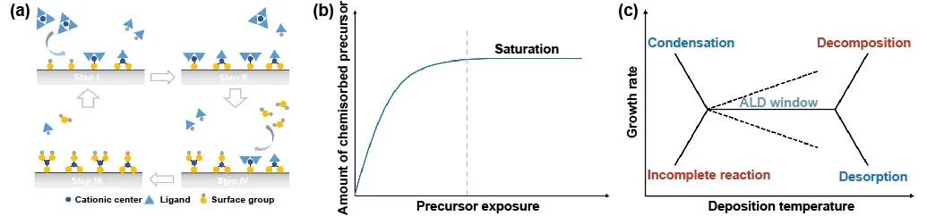 圖1 原子層沉積的基本特性。(a)表面化學(xué)反應(yīng)示意圖;(b)飽和生長特性;(c)溫度窗口。