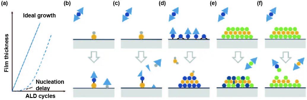 盡管ALD在沉積高質(zhì)量薄膜方面有許多優(yōu)點,但ALD工藝中仍存在非理想因素,深入研究非理想因素對于更好的薄膜質(zhì)量控制至關(guān)重要。為此,作者詳細闡述了ALD中一些典型的非理想因素,包括成核延遲、副產(chǎn)物吸附、配體分解、團聚、離子擴散和刻蝕效應(yīng)(圖3)。