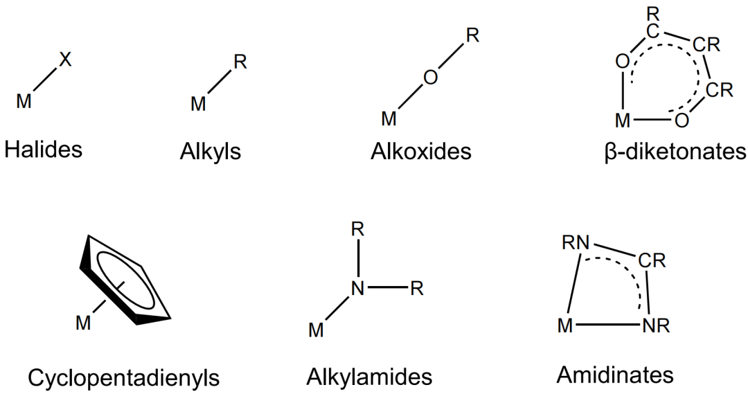 2 、ALD前驅(qū)體化學(xué):ALD前驅(qū)體對薄膜沉積也起著至關(guān)重要的作用。通常,ALD前驅(qū)體應(yīng)具有足夠的揮發(fā)性、熱穩(wěn)定性和自限制反應(yīng)性。揮發(fā)性是所有氣相薄膜沉積技術(shù)的先決條件;良好的熱穩(wěn)定性對于避免前驅(qū)體在加熱時或在襯底表面分解十分重要;前驅(qū)體的自限制反應(yīng)性是保證原子層級別生長的前提。因此多年來,研究者一直致力于前驅(qū)體分子結(jié)構(gòu)設(shè)計,以實現(xiàn)ALD應(yīng)用所需的特性。例如,為了提高前驅(qū)體的揮發(fā)性,其通常采用具有烷基末端的有機配體來減少分子間的相互作用;而螯合結(jié)構(gòu)可以被引入以提高前驅(qū)體的熱穩(wěn)定性。在本文中,作者對目前常用的幾類ALD前驅(qū)體進行了詳細介紹,包括金屬鹵化物、金屬烷基化合物、金屬醇鹽、β 金屬酮鹽化合物、金屬茂基化合物、金屬胺基化合物以及金屬脒基化合物(圖4)。此外,通過合理的結(jié)構(gòu)設(shè)計,在分子中引入不同類型的配體,可以將這幾類ALD前驅(qū)體各自的優(yōu)勢結(jié)合起來,為前驅(qū)體的發(fā)展帶來新的可能。