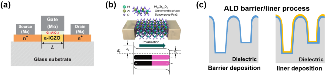 圖5 ALD在微電子領(lǐng)域的應(yīng)用:(a)氧化物薄膜晶體管;(b)鐵電介電層;(c)金屬互連。