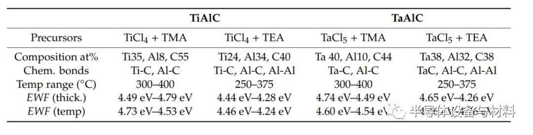 TaAlC一般是用TaCl5作為作為Ti前驅(qū)體,TMA、TEA作為Al前驅(qū)體,從表一其實(shí)可以看出,兩種材料的沉積工藝和性能都非常相似。