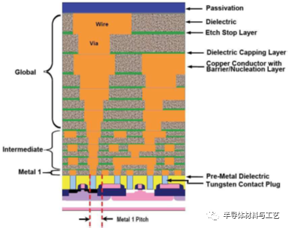 微處理器單元(MPU)中有源器件的功能密度非常高,金屬級的數(shù)量有望達(dá)到1216。此外,隨著柵極數(shù)量增多,柵極之間需要更多的連接,互連線的平均長度將增加。如果不包括全局電線,則MPU中互連的總長度預(yù)計(jì)將超過2 km / cm2。在1990年代后期,很明顯地發(fā)現(xiàn),互連長度的增加導(dǎo)致互連的電阻乘以電容(RC)時(shí)間延遲的增加,并且在四分之一微米的設(shè)備節(jié)點(diǎn)中,傳播延遲超過了固有延遲。