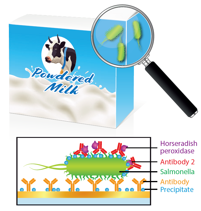 圖2。沙門氏菌的檢測是基于抗體(HRP-Ab2)與細菌的結合和辣根過氧化物酶的生物催化沉淀。幾個HRP-Ab2結合在一個細菌上導致信號呈指數(shù)級擴增。