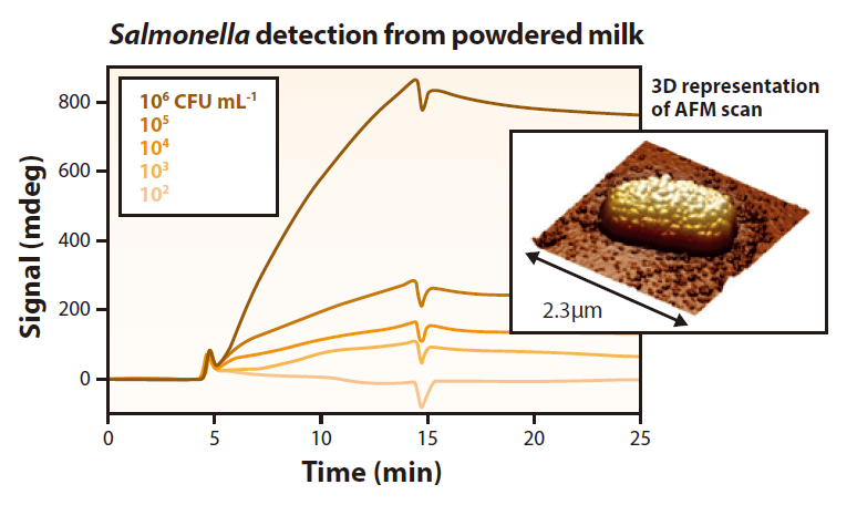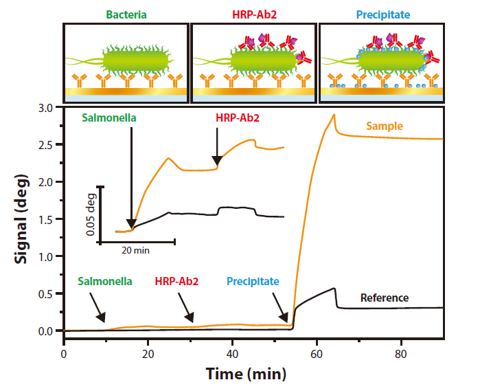 圖1所示。多參數(shù)表面等離子體共振(MP-SPR)檢測奶粉中沙門氏菌。辣根過氧化物酶抗體2 (HRP-Ab2)特異性結合沙門氏菌和沉淀物的形成。