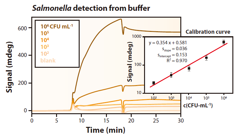 該生物傳感器首先在Biacore 3000 SPR儀器上開發(fā),LOD達到104 CFU/mL。為了進一步改進生物傳感器,選擇了生物催化沉淀反應來提高靈敏度。然而,辣根過氧化物酶需要使用乙醇。Biacore儀器與醇不兼容,不像BioNavis MP-SPR儀器,它對有機溶劑具有優(yōu)異的抵抗力。因此,選擇MP-SPR Navi?210A VASA進行進一步研究。