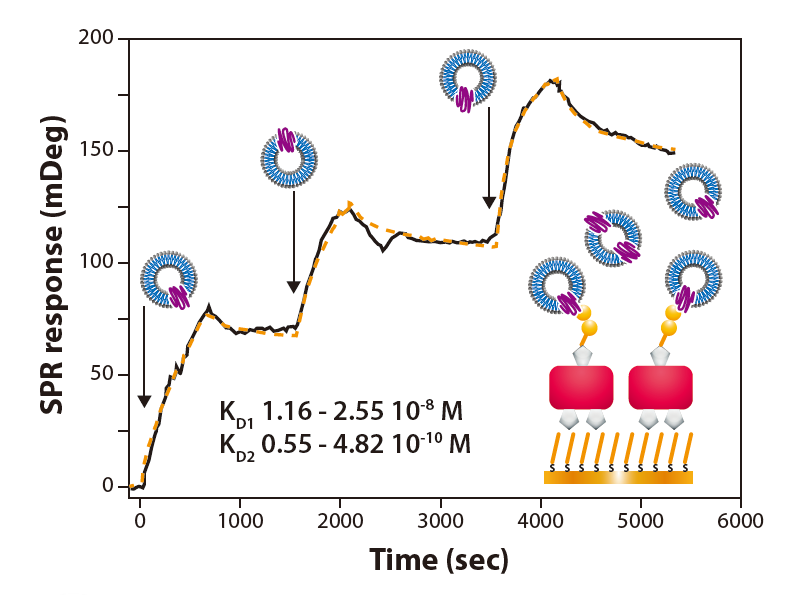 通過MP-SPR確定表面結合肽(LXY30)與流動的細胞外囊泡(SKOV-3)的相互作用(圖1)。使用TraceDrawer?軟件的“兩位點”結合模型分析相互作用,將其解釋為兩組肽分子與一個細胞外囊泡結合。本文對三種假設的電動汽車進行了評估,其中表面α3β1整合素的含量被評估為每顆??偟鞍椎?%,5%或10%。所有三個病例的親和力表明SKOV-3顆粒與表面結合的LXY30配體的強結合(圖2,表1)。在本研究中,僅測量了三種濃度的分析物,然而,通常建議測量五種或更多濃度來評估親和力和動力學。