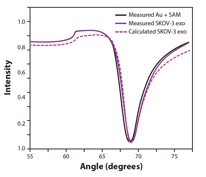 在MP-SPR實驗之前,BioNavis標準金傳感器載玻片被非原位涂覆一層自組裝的生物素化烷烴硫醇(11-巰基-1-十一醇,MuOH)單層(SAM)。進入儀器后,在運行緩沖液TRIS-EDTA (25 mM TRIS, 1mM EDTA, pH 8.0)中設置基線信號,然后在兩個通道中注射鏈霉親和素。生物素化LXY30肽僅在一個通道中引入,留下第二個通道作為參考,不含肽。從最低濃度到最高濃度(3.4 × 109、5.7 × 109和1.7× 1010顆粒/ml)順序注射,將卵巢癌細胞外囊泡SKOV-3加載到兩個通道中。使用TraceDrawer?for MP-SPR Navi?和MP-SPR Navi?LayerSolver對數據進行分析。