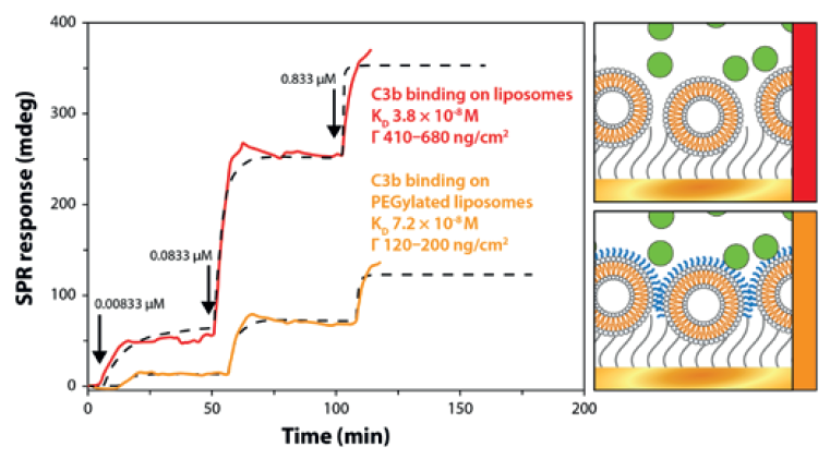 在另一項(xiàng)研究中,使用MP-SPR測(cè)量了C3b分子與脂質(zhì)體的結(jié)合。C3b是先天免疫系統(tǒng)的一部分,它作為一種調(diào)理劑增強(qiáng)吞噬作用(更具體地說(shuō),標(biāo)記細(xì)胞進(jìn)行吞噬)。C3b對(duì)聚乙二醇化寡聚胍脂質(zhì)修飾(OGP + PEG)脂質(zhì)體的親和力為KD = 7.2 × 10?8 M,表面質(zhì)量密度Γ = 120 ~ 200 ng/cm2。不含PEG的脂質(zhì)體上的結(jié)合水平較高。