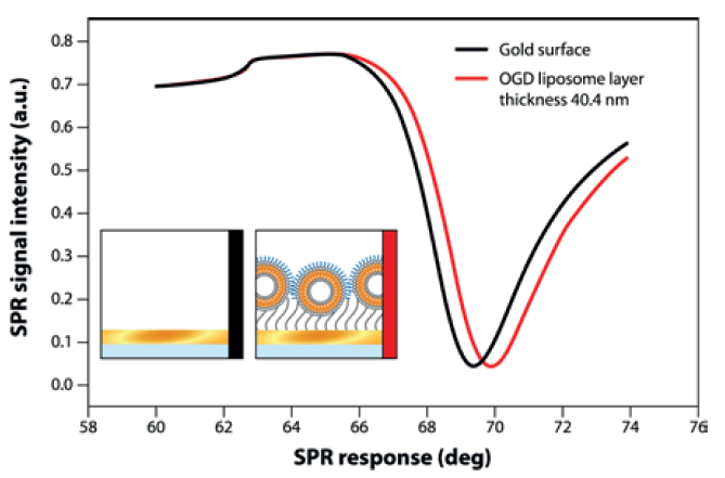 圖4。測(cè)定脂質(zhì)體沉積前后的全SPR曲線。使用LayerSolver?計(jì)算脂質(zhì)體層的厚度(d)和折射率(n)。