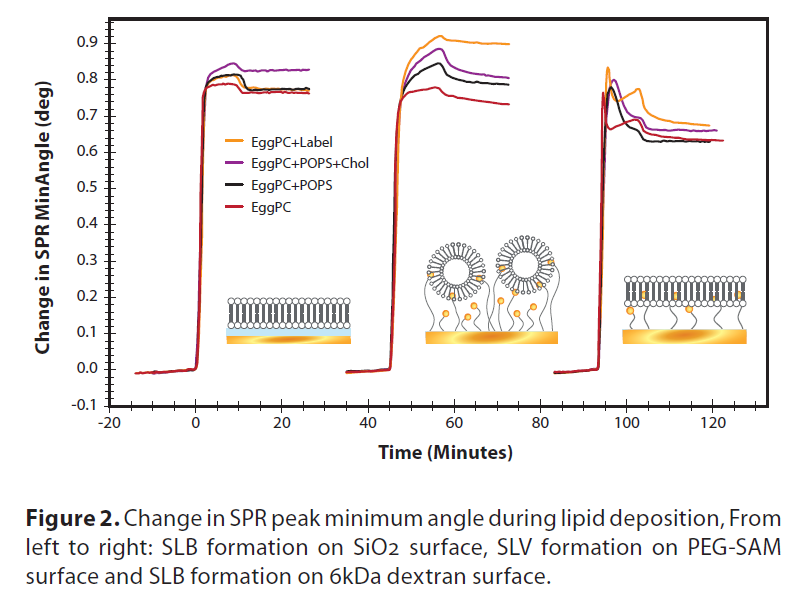脂質(zhì)體或脂雙分子層形式的支撐脂層可以沉積在SPR傳感器載玻片上。MP-SPR是一種在不知道沉積層厚度和折射率的情況下確定沉積層厚度和折射率的獨(dú)特方法。支持脂質(zhì)層可以進(jìn)一步用于藥物發(fā)現(xiàn)和開發(fā)、生物傳感和生物物理學(xué)等領(lǐng)域,以確定分子與脂質(zhì)層的相互作用。
