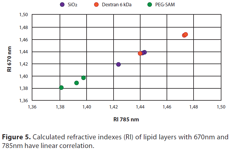即使6kDa葡聚糖和PEG-SAM都是相對(duì)較薄(幾納米)的親水凝膠載體,葡聚糖表面明顯促進(jìn)SLB的形成,而PEG-SAM支持SLV的形成。計(jì)算的厚度和RI值顯示右旋糖酐上的脂質(zhì)層與PEG-SAM上的脂質(zhì)層有明顯差異(圖4)。表面促進(jìn)行為的差異很可能是由于聚合物親水性基團(tuán)的密度和位置不同。右旋糖酐支持所使用的三種脂質(zhì)組合物的脂質(zhì)雙層形成(圖4)。