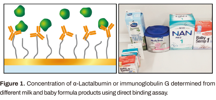 樣品是從芬蘭超市購買的不同的奶制品(圖1)。粉末樣品根據(jù)包裝上的說明制備成液體形式,并進(jìn)一步稀釋1000或50倍(正常牛奶)和5000倍(嬰兒產(chǎn)品)。使用90秒的樣品注射(校準(zhǔn)或牛奶樣品),120秒的等待時(shí)間和60秒的ALAB再生注射進(jìn)行測(cè)量。IgG注射時(shí)間較長(zhǎng)。ALAB的校準(zhǔn)范圍為0 - 1000 ng/mL, IgG的校準(zhǔn)范圍為0 - 75 000 ng/mL。校正曲線符合4參數(shù)Low-High方程,也可用于測(cè)定樣品中的蛋白質(zhì)濃度。