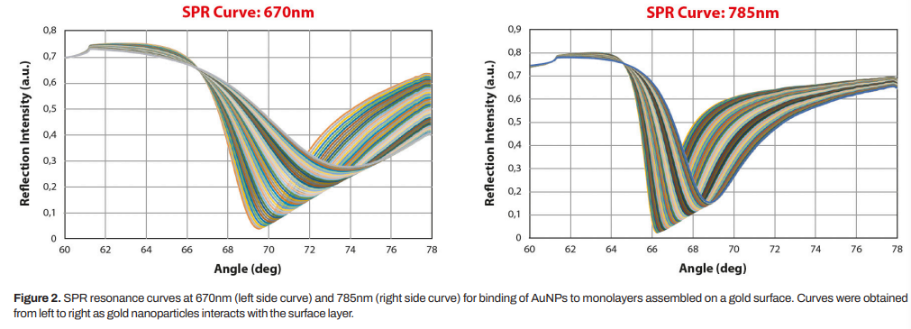 在金表面組裝具有官能團(tuán)的單層膜可用于金納米粒子的偶聯(lián)。在這項(xiàng)研究中,MP-SPR被證明是實(shí)時(shí)測定金屬納米顆粒沉積到表面層的獨(dú)特方法。AuNPs表現(xiàn)出強(qiáng)烈的表面等離子體共振,當(dāng)納米顆粒與表面層相互作用時(shí),MP-SPR甚至可以觀察到很大的響應(yīng)。鏈末端的官能團(tuán)可以錨定金納米顆粒,甚至嵌入到鏈中。MP-SPR是一種獨(dú)特的工具,用于研究金屬納米顆粒在傳感器、電子、光子學(xué)、太陽能電池或癌癥診斷和治療中的應(yīng)用。