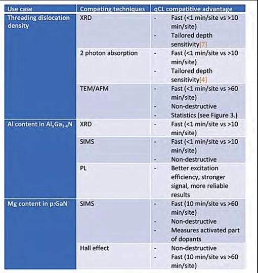 我們方法的優(yōu)點(diǎn)之一是測(cè)量過(guò)程不破壞材料。因此本技術(shù)可以避免晶片的定期破壞性的性能測(cè)試 - 考慮到其他所有替代技術(shù)都具有材料破壞性,本技術(shù)將成為氮化鎵 HEMT 中鎂參雜量測(cè)定技術(shù)中的佼佼者。第二個(gè)突出的優(yōu)點(diǎn)是該技術(shù)測(cè)量過(guò)程相對(duì)較快,可以從每個(gè)晶片的數(shù)十個(gè)位置進(jìn)行采集,因此可以測(cè)試片內(nèi)均勻性。第三個(gè)突出優(yōu)點(diǎn)是該方法具有多功能性,可測(cè)量穿透位錯(cuò)密度,鋁鎵氮成分和鎂摻雜量等。盡管該技術(shù)由于需要在真空下更換晶圓,使得更換待測(cè)樣品耗費(fèi)時(shí)間,但此技術(shù)為晶圓廠(chǎng)節(jié)省的空間與降低的反饋周期復(fù)雜性依然使其充滿(mǎn)競(jìng)爭(zhēng)力。(表 1 羅列了使用該技術(shù)的優(yōu)勢(shì),同時(shí)概述了其他技術(shù)的優(yōu)缺點(diǎn))。