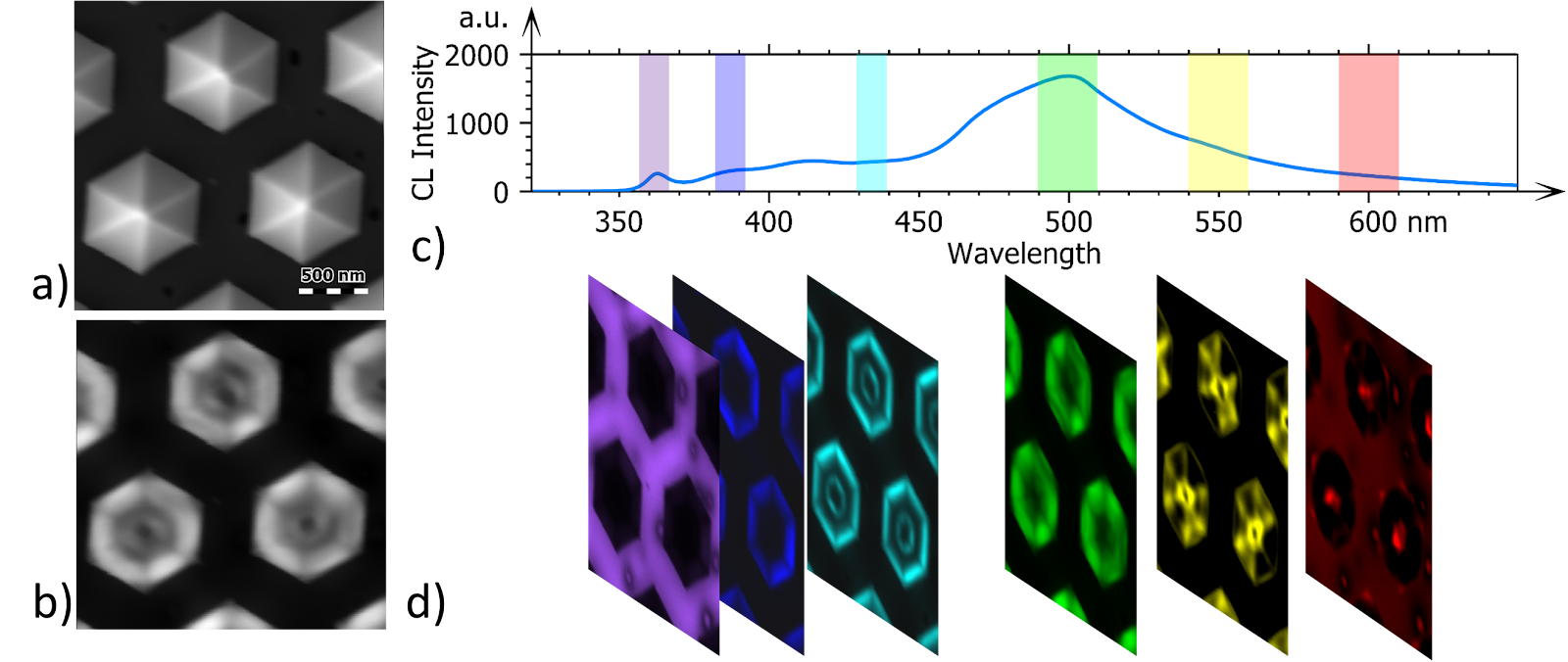1、GaInN/GaN多量子殼納米線微發(fā)光二極管(MicroLED)是下一代顯示設(shè)備的有力競爭者。利用CL超光譜成像技術(shù)可以對它們的發(fā)光特性進行詳細表征。下圖a和b展示了從頂部視角獲取的結(jié)構(gòu)的二次電子(SE)和全色CL強度圖像。圖c展示了整個圖像的平均發(fā)射光譜。通過在不同波長范圍(通常在發(fā)射峰附近)上積分發(fā)射強度,可以得到不同的圖像(圖d),稱為彩色帶圖像,這些圖像可以代表堆疊中的特定材料或一種材料的特定特性。