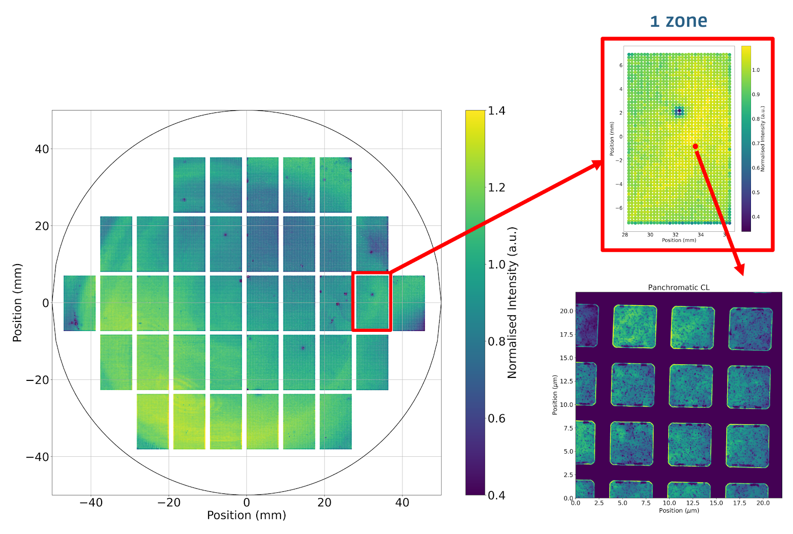 2、qCL使得在每個器件內(nèi)部、器件之間以及晶圓全表面各區(qū)域之間進行比較成為可能。這種定量比較對于識別工藝變化和潛在故障具有極大的價值。它能夠平滑地銜接納米尺度和毫米尺度的器件特性,并能夠高效地表征沉積工藝的均勻性、光刻工藝的質(zhì)量以及器件的基本發(fā)射特性,下圖為使用全晶圓qCL工具(Santis 300)獲取的MicroLED陣列全晶圓圖譜。qCL的使用確保了每個器件、不同器件之間、晶圓區(qū)域之間以及不同晶圓和晶圓批次之間的光強度測量結(jié)果具有可比性,這對于生產(chǎn)監(jiān)控至關(guān)重要。