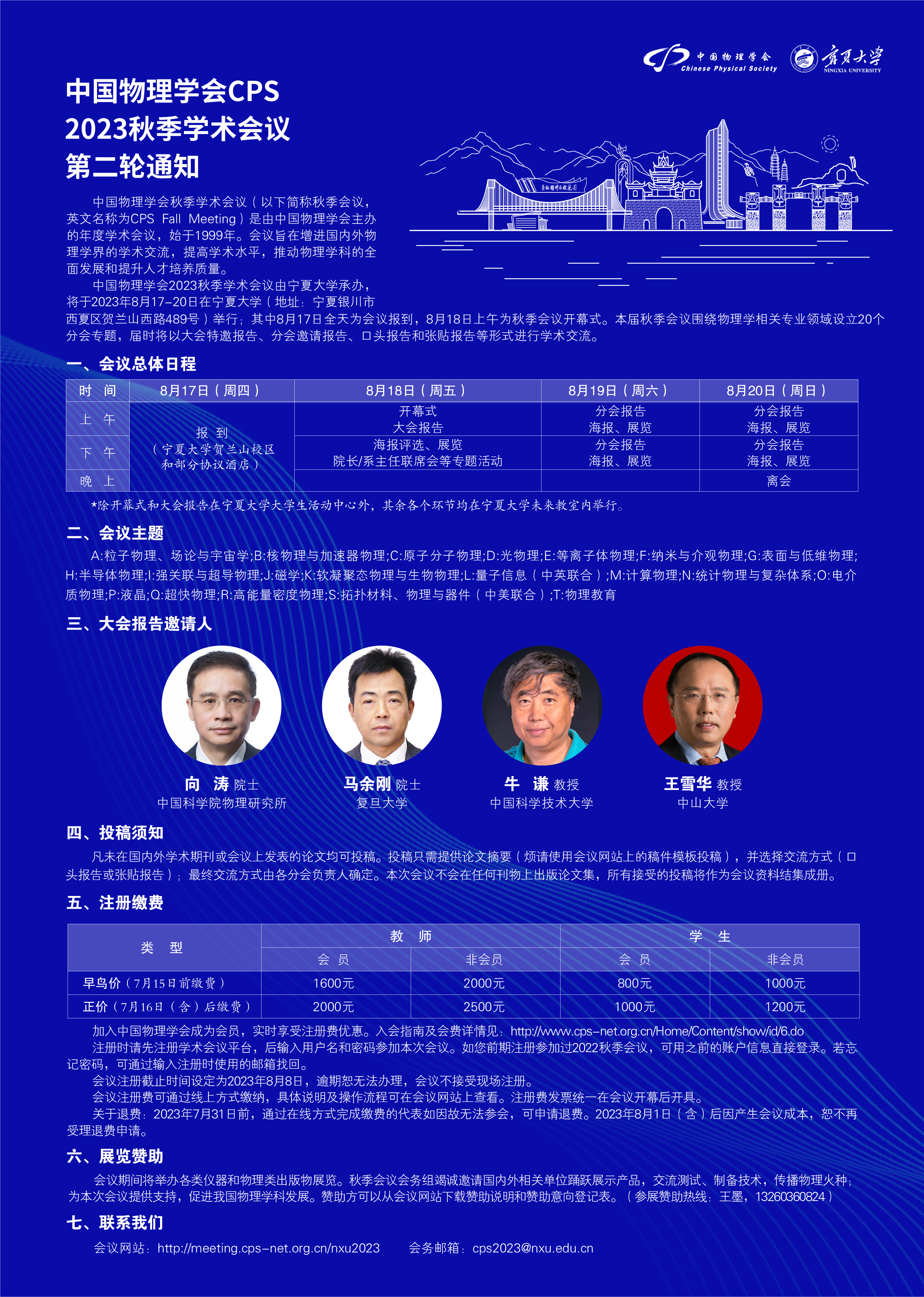 為加強國內(nèi)外物理學(xué)界的學(xué)術(shù)交流,提高學(xué)術(shù)水平,推動物理學(xué)科的全面發(fā)展和提升人才培養(yǎng)質(zhì)量,中國物理學(xué)會2023秋季學(xué)術(shù)會議將由寧夏大學(xué)承辦,定于2023年8月17日至20日在寧夏大學(xué)舉行。