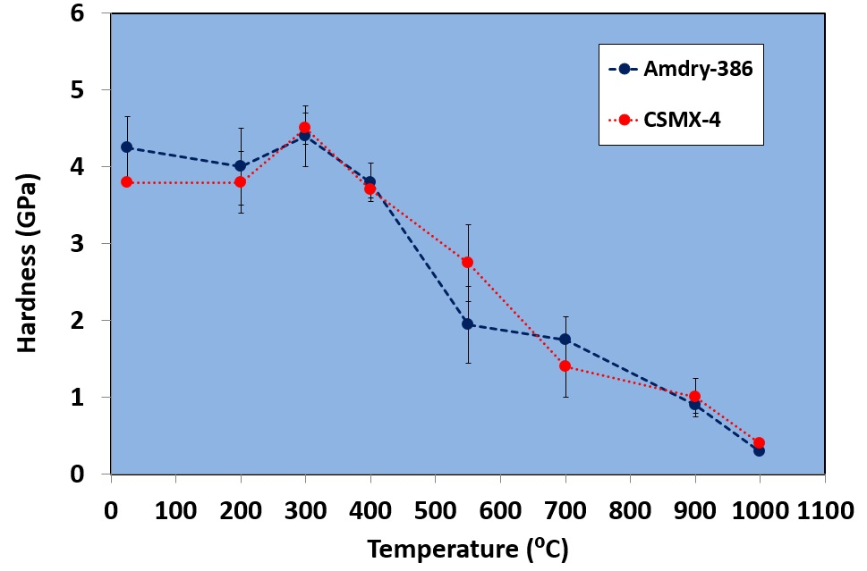 圖1Amdry-386結(jié)合涂層和高溫合金基體的硬度在25 -1000℃范圍內(nèi)的溫度依賴性。