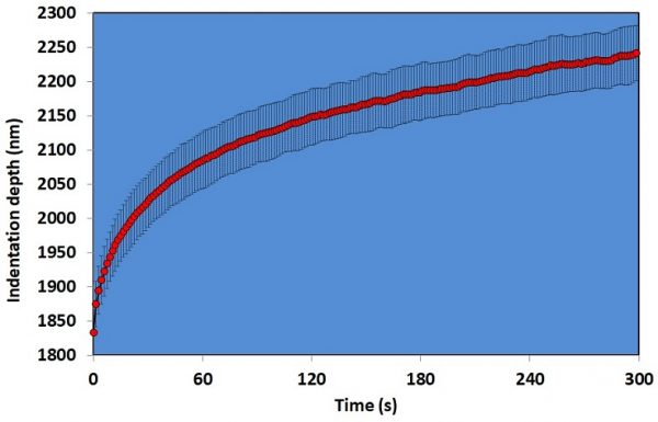 圖5 鎢在945℃下300 s內(nèi)壓痕蠕變的發(fā)展。在200 mN下重復(fù)試驗(yàn)3次的平均值和標(biāo)準(zhǔn)偏差。